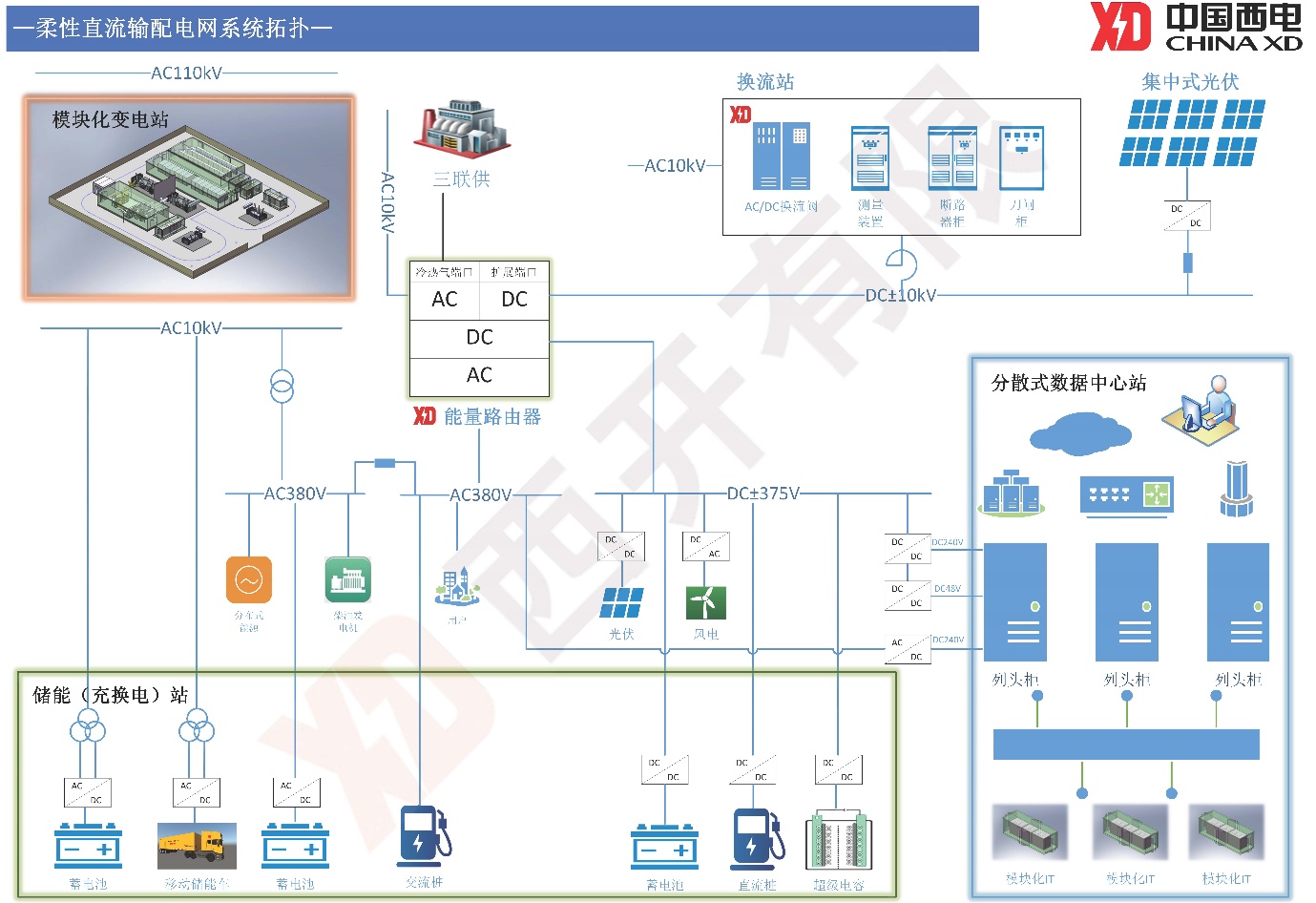 以能量路由器为枢纽的柔性直流输配电系统可作为多站间的连接器,高效的连接变电站、储能站、数据中心站,实现由清洁能源至直流负荷的高效传输,网荷储协同供电。