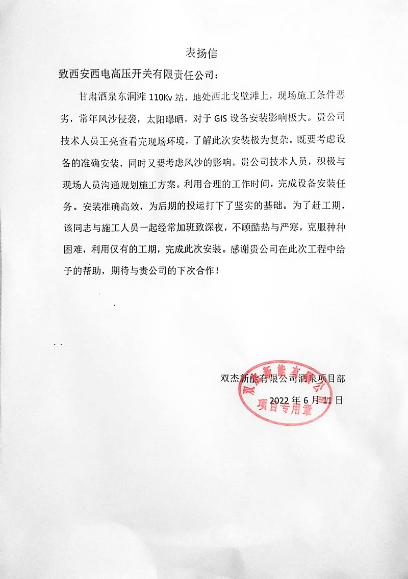 收到双杰新能有限公司酒泉项目部发来的表扬信,对足球赔率