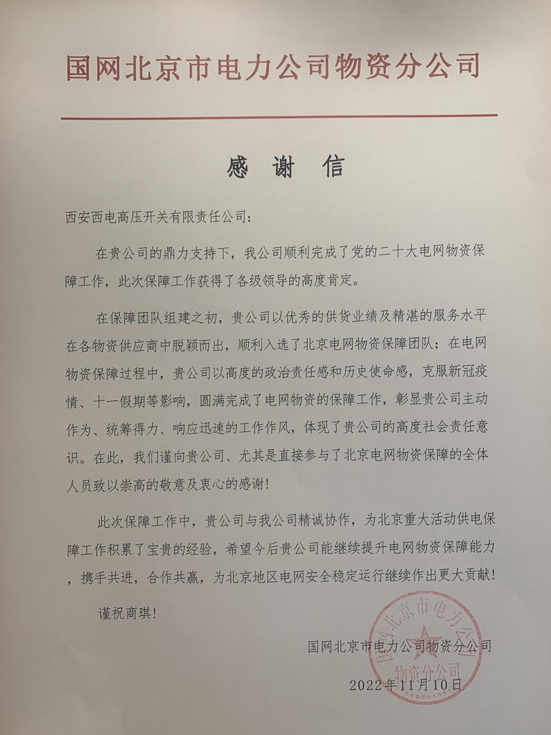 未雨绸缪,坚守使命,精心策划,全面落实,制定二十大保电应急保障方案,成立产品服务应急安全保障小组,组织技术人员整理备品备件清单,落实物料库存情况;强化电力安全保障能力,安排华北片区王鹏亮、服务人员杨群波同志于10月1日前抵达北京,开展电网物资保障工作,严格落实应急值班24小时管理制度,确保遇到突发状况处置高效,供电安全万无一失。保电期间现场人员严精细实、专业专注的出色表现和优质服务也获得了用户的高度认可。