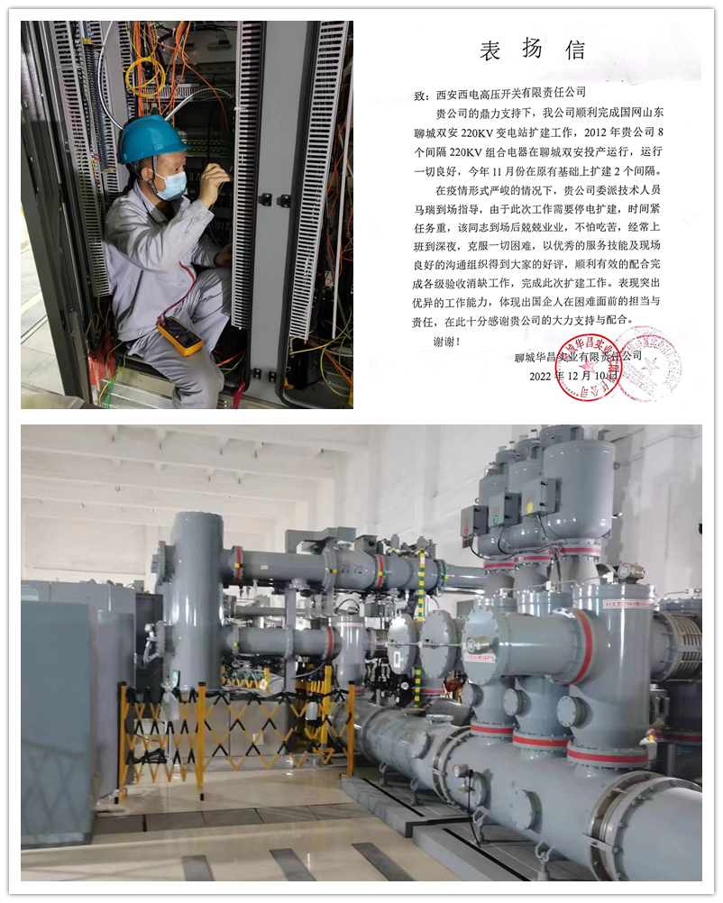 为该工程提供14个间隔ZF1-252组合电器产品。从8月份施工开始,孟国祥同志屡次克服疫情困难,积极前往现场开展设备安装,严格把控质量关,最终14个间隔ZF1-252组合电器耐压试验一次性通过,成功投运。工作开展过程中他认真负责的态度得到了业主方的大力表扬。