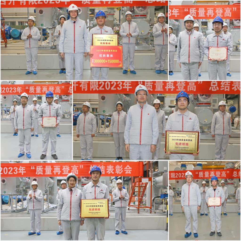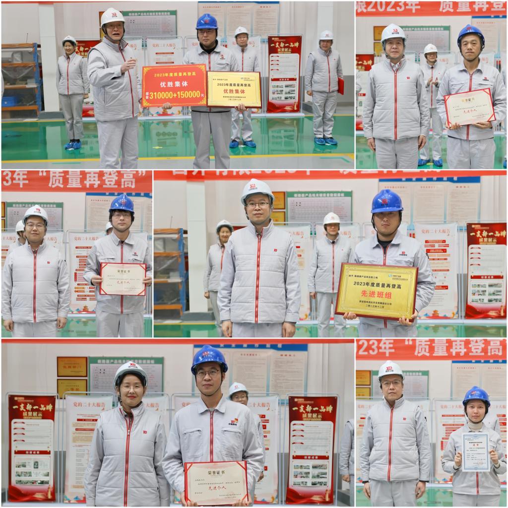 副总经理贺小瑞首先宣读《关于表彰2023年质量再登高先进集体的决定》,隔离开关产品线等四条产品线荣获“质量再登高”优胜集体,质量管理处等5个部门获得“质量再登高”先进集体,断路器产品线总装三线等8个班组荣获“质量再登高”先进班组,电气测控产品线谷珂等12人获得优秀个人称号。公司领导向先进集体和个人颁发了奖牌和证书,优胜集体和先进个人代表分别作了交流发言。