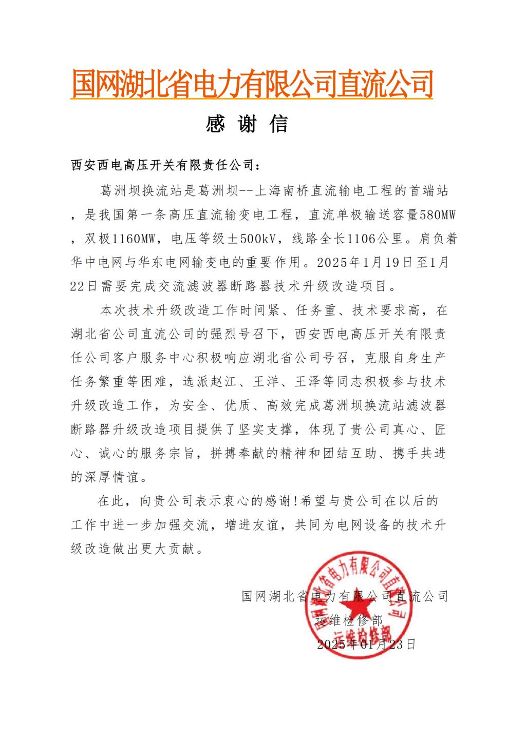 在特高压直流输电设备领域的专业技术实力以及对客户需求的快速响应和高效执行能力,也进一步加深了我司与国网湖北电力有限公司直流公司的合作关系,为未来双方更多的合作打下坚实基础。